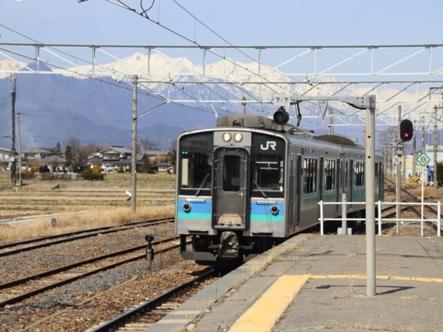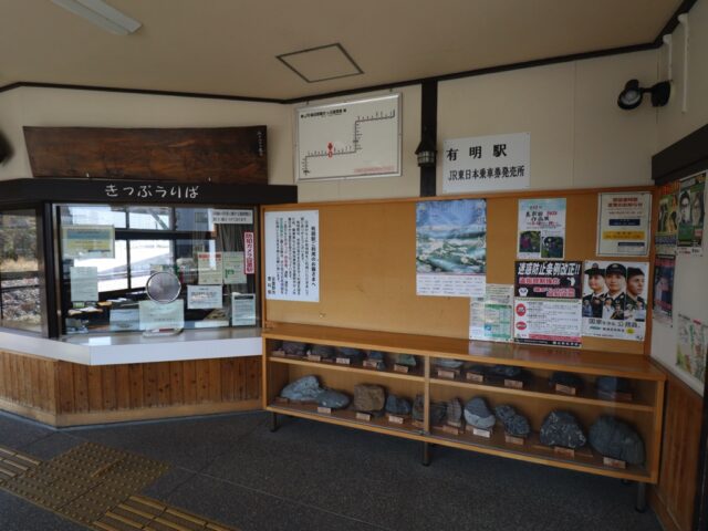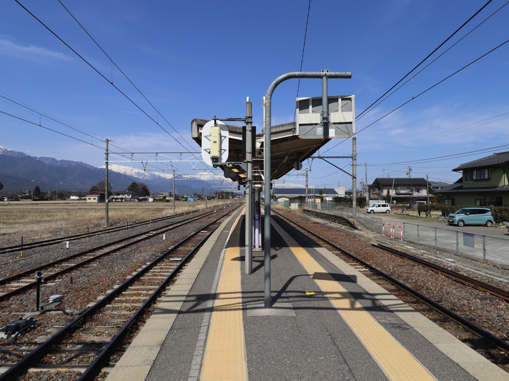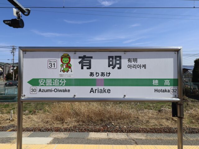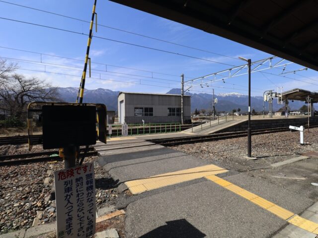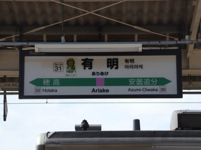 有明駅 大糸線の駅、有明の改札画像です。 駅名標 駅名標 駅舎、山小屋風の外観をした木造駅舎が建つ 改札口、当駅は有人駅であり、安曇野市委託の係員による集札が行われる 出場側から見た改札口の様子 当駅には出札窓口が設けられており、きっぷの購入が可能である。駅舎内には石が展示されている。 駅舎内部は待合室となっている 駅舎からホームへは構内踏切を渡って移動する ホームは島式1面2線であり、列車の行き違いおよび折り返しが可能である。1日に数本当駅で松本方面へ折り返す列車が存在する。 当駅ホームからは北アルプスの勇姿を間近に望むことができる ————————————— 所在地:長野県安曇野市 所属路線 ■ 大糸線