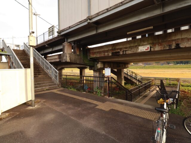 駅入口、ホームに通じる階段がホーム毎に設けられており、ホーム同士の行き来は高架下の通路にて行う