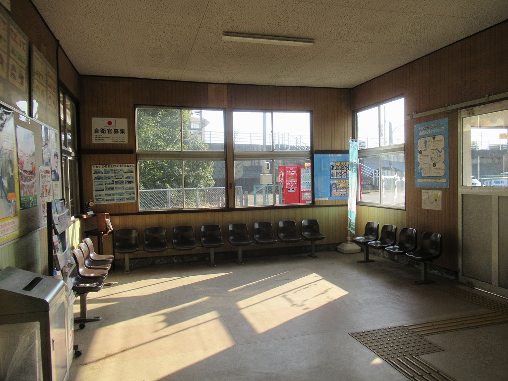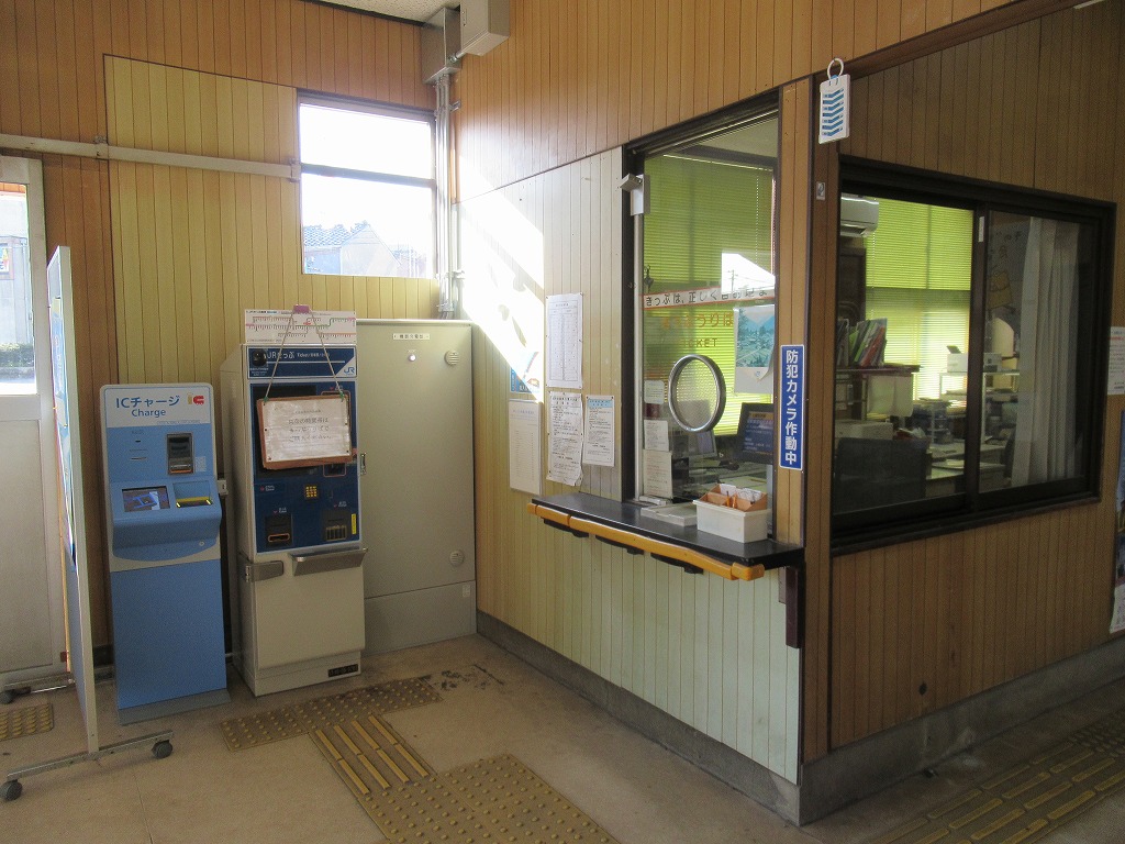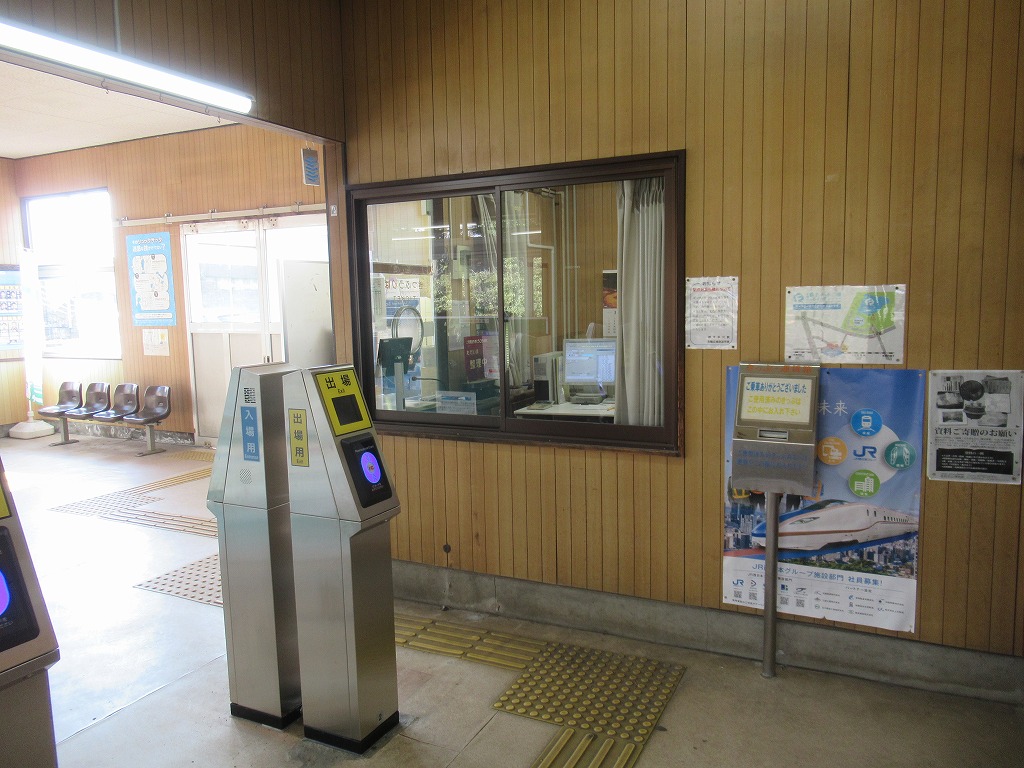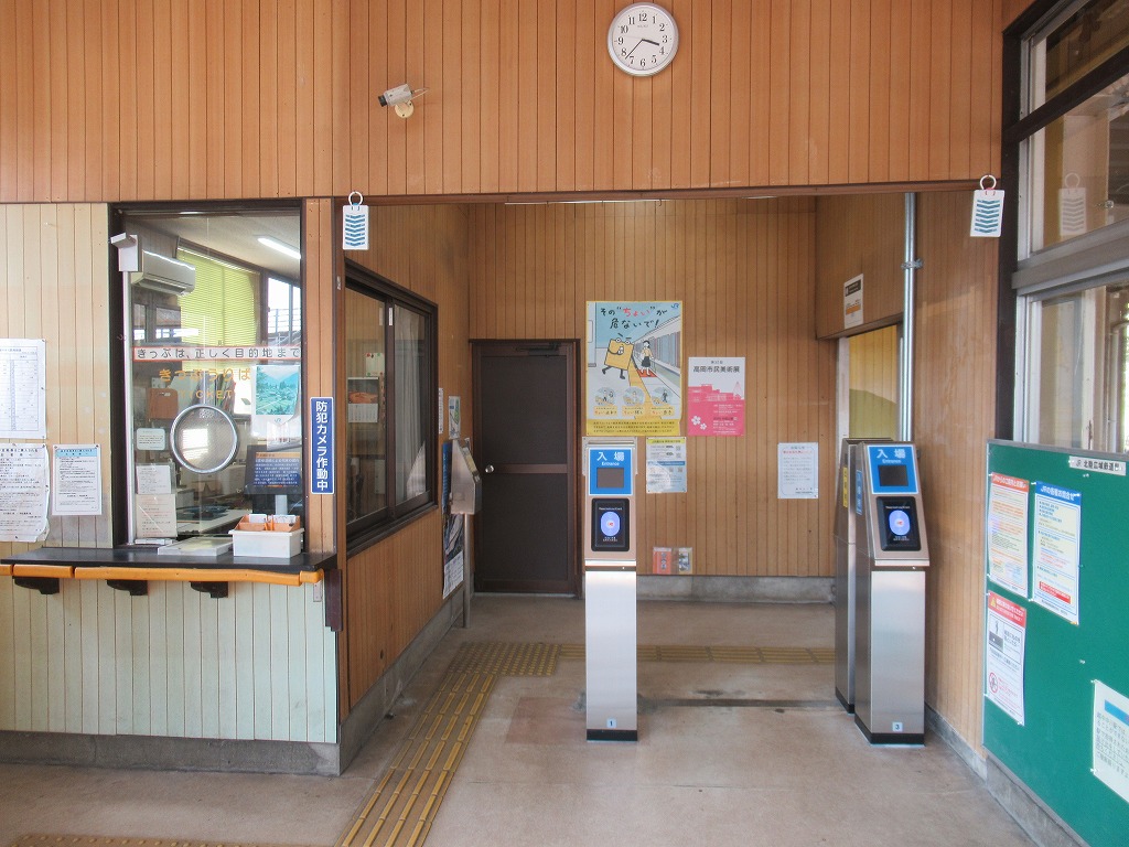 越中中川駅 氷見線の駅、越中中川の改札画像です。 駅名標 駅舎、木造駅舎であるが、当駅周辺の高校の生徒によりペイントされている。 改札口、IC専用自動改札機が2台設置されている。当駅は高岡市の市街地に位し、駅周辺には高校が多数あり通学客の利用が多い。そのため、高岡駅を除いた氷見線の駅では最も利用者が多い。 ICOCA導入前の改札口の様子、自動印字機が設置されていた。 ホーム側から見た改札口の様子、集札箱がホーム側に置かれている。 当駅には有人窓口があり、自動券売機とICカードチャージ機も各1台置かれている。 駅舎内にはベンチが置かれ、広々とした待合スペースが設けられている。 ホームは単式1面1線の棒線駅となっており、行き違いは不可能である。 ————————————— 所在地:富山県高岡市 所属路線 ■ 氷見線