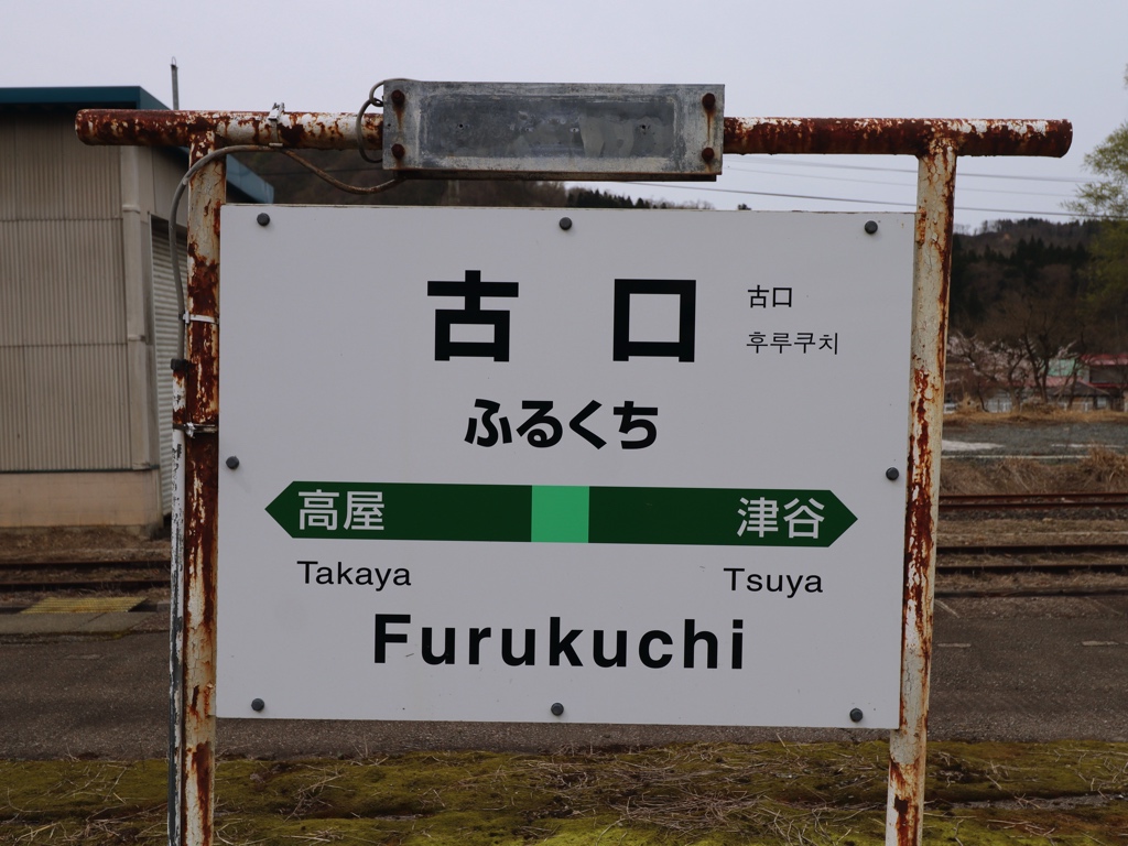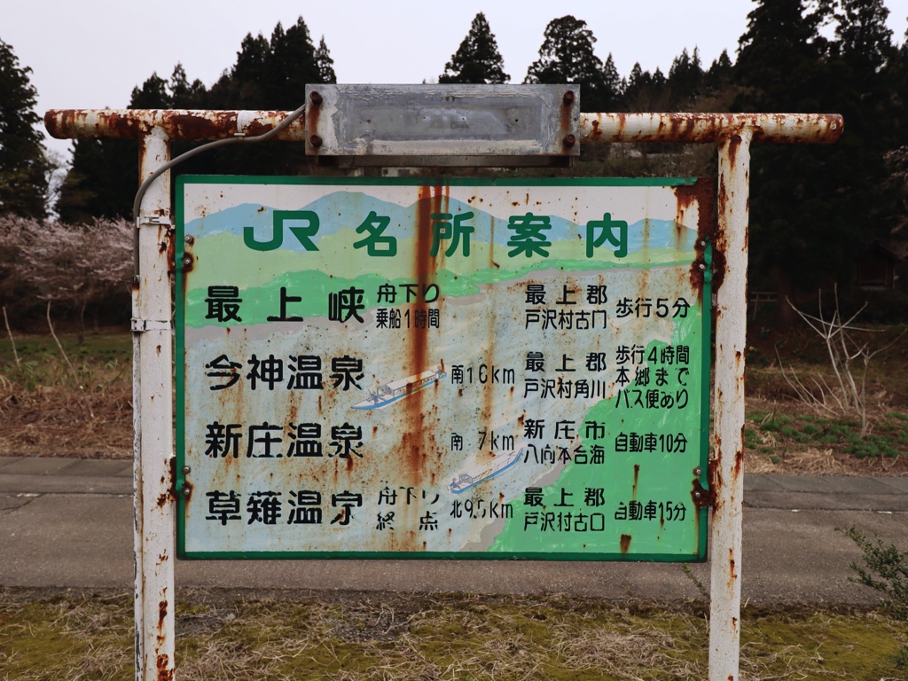 当駅設置の名所案内看板、最上峡と思われるイラストが入る