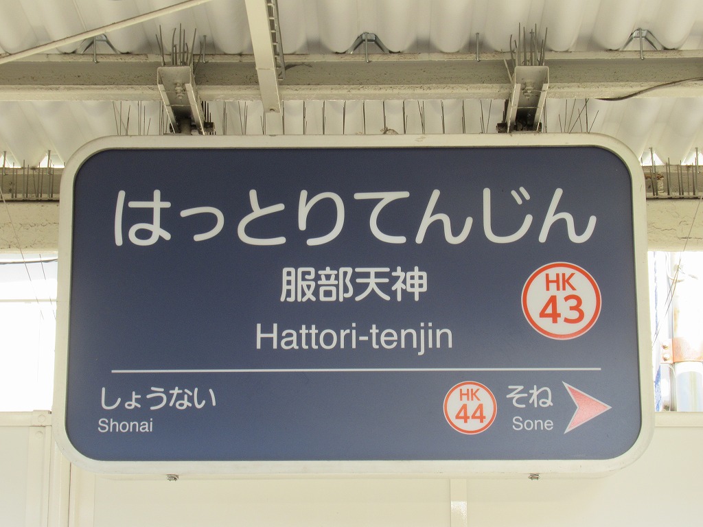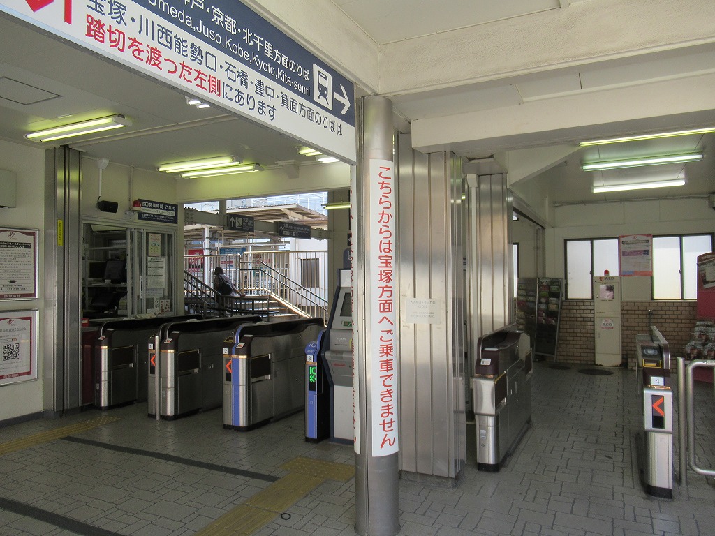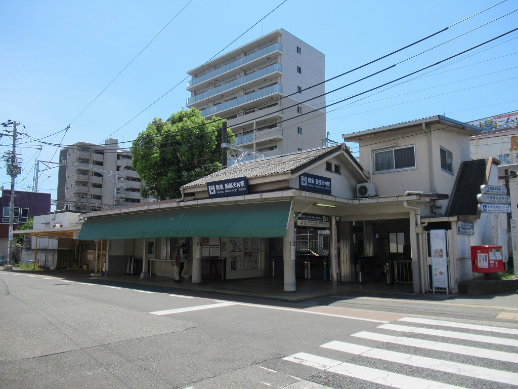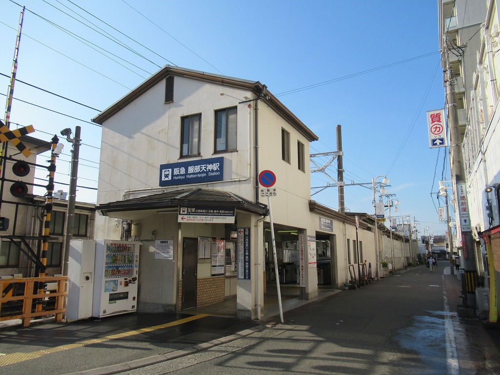 服部天神駅 阪急宝塚線の駅、服部天神の改札画像です。 駅名標、2013年に服部駅から現在の駅名に改称された。 当駅設置のバス・タクシーの案内看板 大阪梅田方面駅舎、木造の歴史ある駅舎が今も残る。 大阪梅田方面改札、自動改札機が4通路設置されている 宝塚方面駅舎、木造と思われる歴史ある駅舎が残る 宝塚方面改札、無人改札となっており、自動改札機が4通路設置されている ホームは相対式2面2線となっている。当駅の改札内に跨線橋や構内踏切は設置されておらず、ホーム間の移動は一度改札口を出る必要がある 大阪梅田方面ホームには、クスノキが屋根を突き抜けて生えている。これは当駅が服部天神宮の境内に開設された駅であるためであり、御神木として親しまれている。なお同じように駅のホームにクスノキがある駅として京阪本線の萱島駅がある。 宝塚方面ホームから見た御神木の様子、木の幹に合わせて屋根には穴が開けられている。 当駅の駅前にはパチンコ屋「服部会館」があり、忍者ハットリくんに似たキャラクターがいたるところに描かれている。 パチンコ屋の文字盤は夜になると光るようである。 駅前のシャッターにもパチンコをする忍者の姿が描かれている。 ————————————– 所在地:大阪府豊中市 乗入路線 ■ 阪急宝塚線