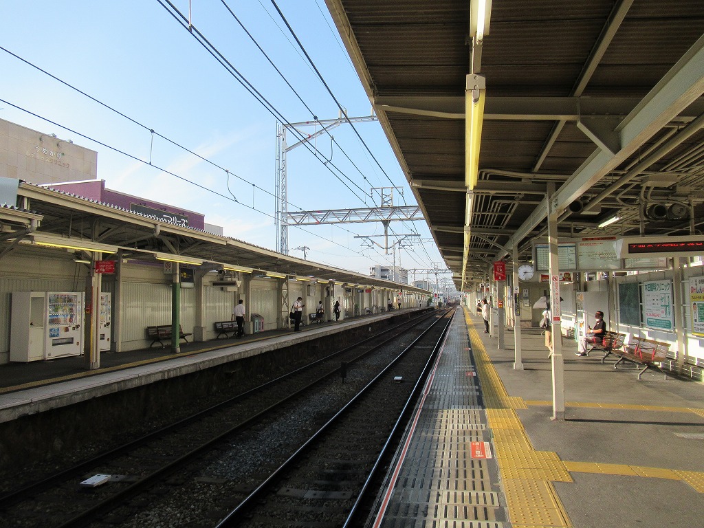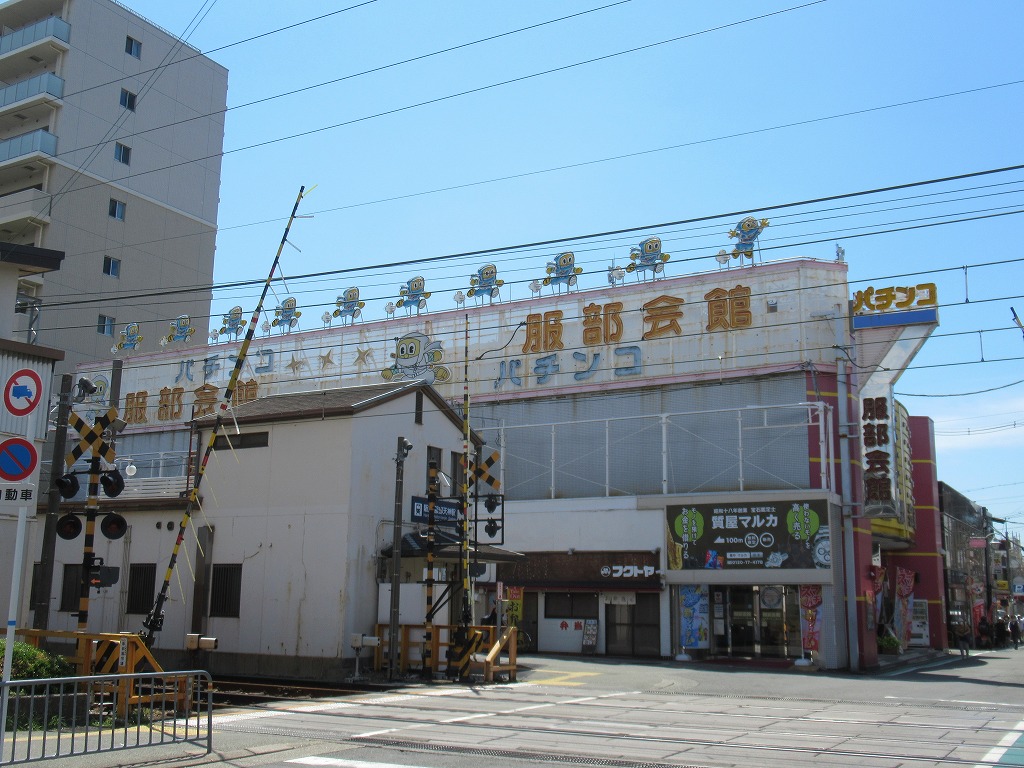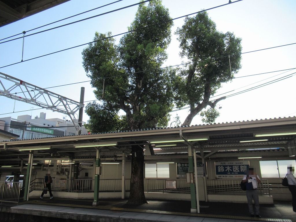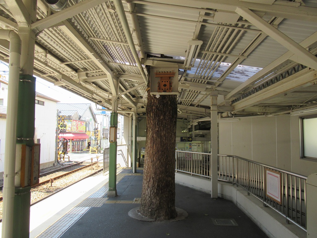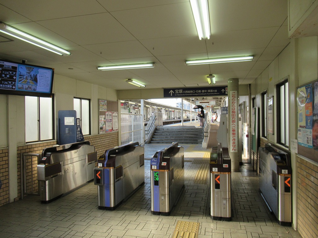 服部天神駅 阪急宝塚線の駅、服部天神の改札画像です。 駅名標、2013年に服部駅から現在の駅名に改称された。 当駅設置のバス・タクシーの案内看板 大阪梅田方面駅舎、木造の歴史ある駅舎が今も残る。 大阪梅田方面改札、自動改札機が4通路設置されている 宝塚方面駅舎、木造と思われる歴史ある駅舎が残る 宝塚方面改札、無人改札となっており、自動改札機が4通路設置されている ホームは相対式2面2線となっている。当駅の改札内に跨線橋や構内踏切は設置されておらず、ホーム間の移動は一度改札口を出る必要がある 大阪梅田方面ホームには、クスノキが屋根を突き抜けて生えている。これは当駅が服部天神宮の境内に開設された駅であるためであり、御神木として親しまれている。なお同じように駅のホームにクスノキがある駅として京阪本線の萱島駅がある。 宝塚方面ホームから見た御神木の様子、木の幹に合わせて屋根には穴が開けられている。 当駅の駅前にはパチンコ屋「服部会館」があり、忍者ハットリくんに似たキャラクターがいたるところに描かれている。 パチンコ屋の文字盤は夜になると光るようである。 駅前のシャッターにもパチンコをする忍者の姿が描かれている。 ————————————– 所在地:大阪府豊中市 乗入路線 ■ 阪急宝塚線