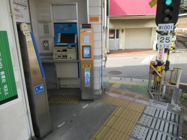 上栄町駅 京阪京津線の駅、上栄町の改札画像です。 御陵方面路線図入り駅名標 御陵方面駅名標 びわ湖浜大津方面路線図入り駅名標 びわ湖浜大津方面駅名標 御陵方面駅入口、御陵方面ホームには駅舎は無くホームへダイレクトに行く構造になっている。 御陵方面改札口、ホーム上にIC専用簡易改札機が設置されている。 ホーム上には勝手口のようなものがあったが取材時は使用されていなかった。 勝手口からは通路が延びており、県道558号線の脇へと伸びている。 県道558号線側から勝手口を撮影、出入口はフェンスで覆われている。 県道558号線側フェンス手前より撮影した勝手口通路部分の様子 御陵方面ホーム、千鳥式配置の2面2線のホームとなっている。 びわ湖浜大津方面駅舎、木造の細長い駅舎となっている。 駅の左には便所が設けられている。 便所には「お手洗」の看板が設置されている。 びわ湖浜大津方面改札口、ホームに向かう通路上にIC専用簡易改札機が設置されている。 駅入口部分にはのりこし精算機が置かれている。 びわ湖浜大津方面ホーム、千鳥式配置の2面2線のホームとなっている。線路は京都方面から下り勾配となっており当駅は御陵方面は上り勾配、びわ湖浜大津方面は下り勾配になっている。 ————————————————– 所在地:滋賀県大津市 乗入路線 ■ 京阪京津線