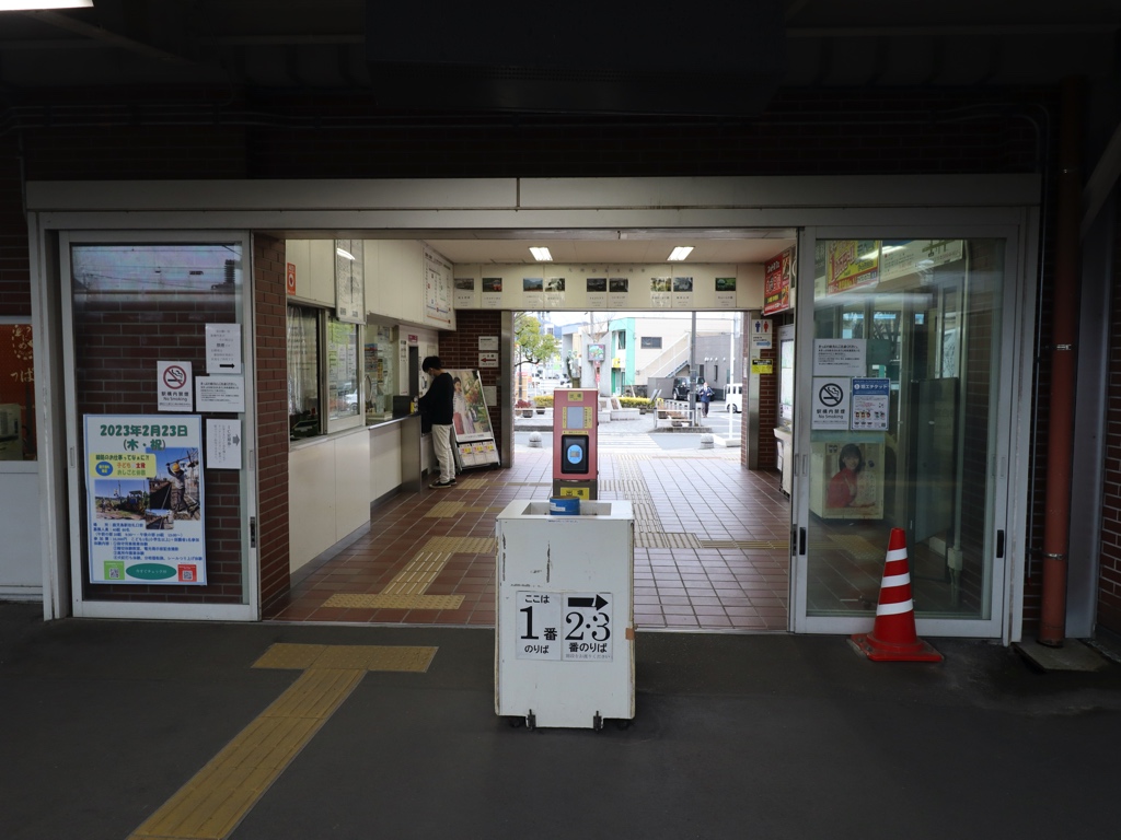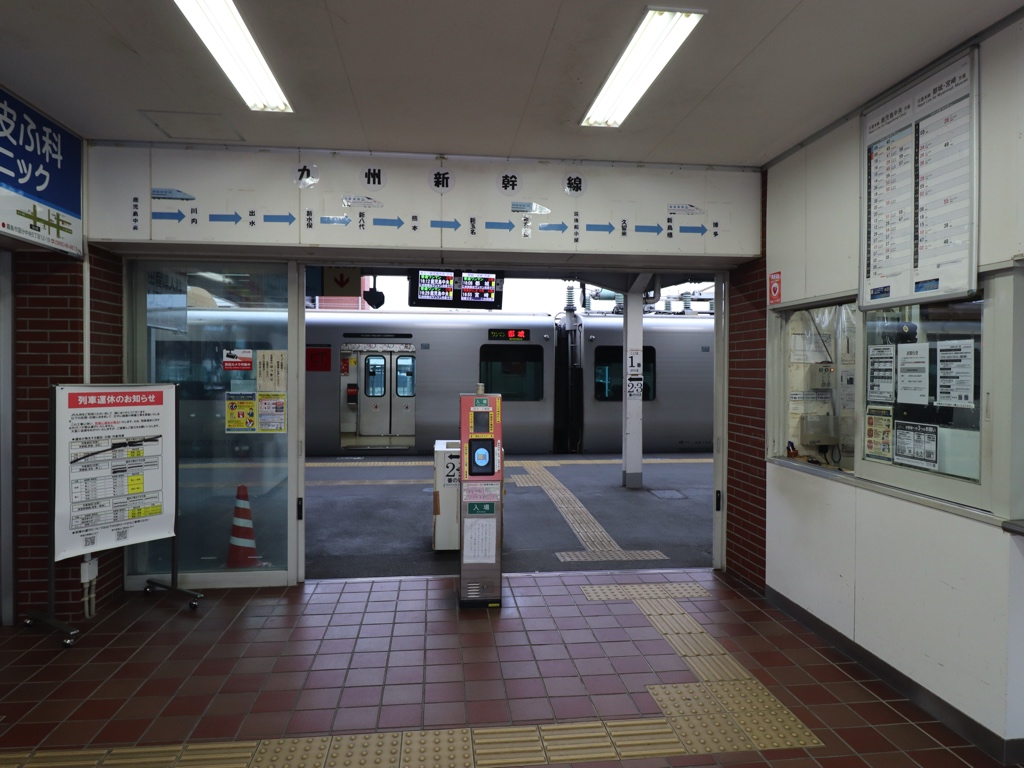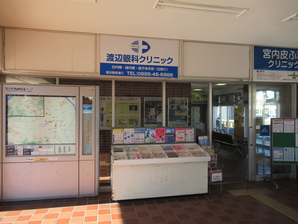 国分駅 日豊本線の駅、国分の改札画像です。 駅名標、桜島の眺望が美しいことで知られる「国分城山公園」のイラストが入る 駅名標、当駅は日豊本線の運行上の主要駅の一つであり、特急きりしま号の全列車が停車するほか、普通列車はほとんどの列車が当駅始発・終着となる。隼人・鹿児島中央方面と比べ都城・宮崎方面への普通列車の本数は激減する 駅舎、鉄筋コンクリート造りの駅舎となっている 改札口、当駅は有人駅となっており、IC専用簡易改札機が設置されている。SUGOCA等の交通系ICは当駅から日豊本線の隼人・鹿児島中央方面のみ利用可能であり、日豊本線の霧島神宮・都城方面および肥薩線への利用はできないため注意しよう 出場側から見た改札口の様子 当駅にはみどりの窓口および自動券売機が設置されている 駅舎内部には待合室が設けられている 待合室内部は広々とした空間となっている ホームは2面3線であり列車の行き違い・折り返しが可能である。かつて当駅は志布志駅に向かう大隅線の始発駅でもあったが1987年3月14日に廃線となっている ————————————— 所在地:鹿児島県霧島市 乗入路線 ■ 日豊本線