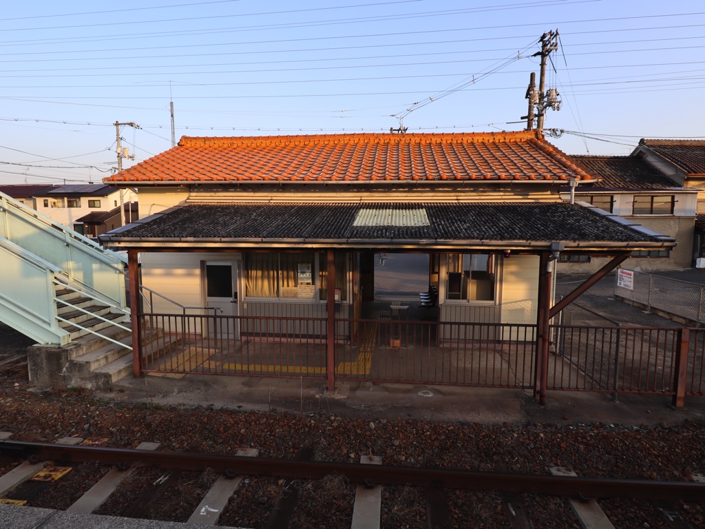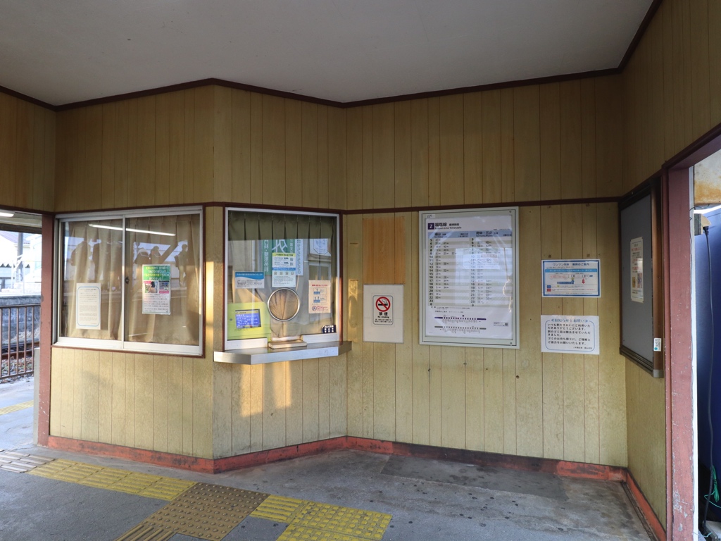 駅舎、福塩線の電化区間(福山ー府中間)では、取材時点で現存する数少ない木造駅舎の1つである