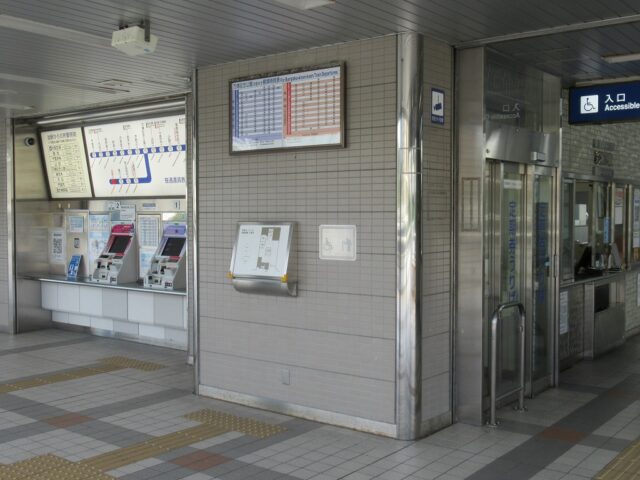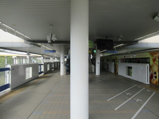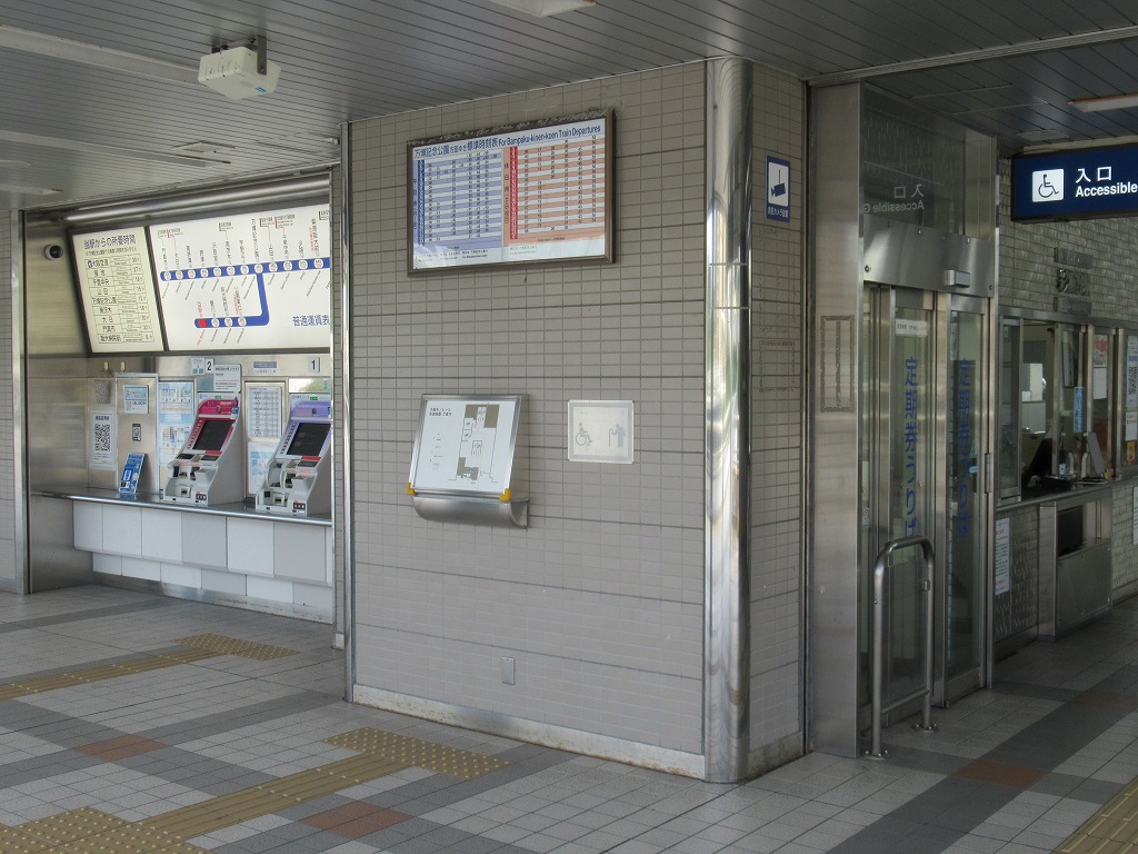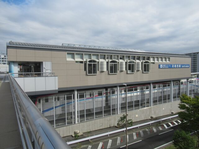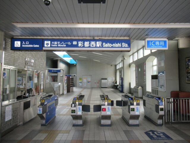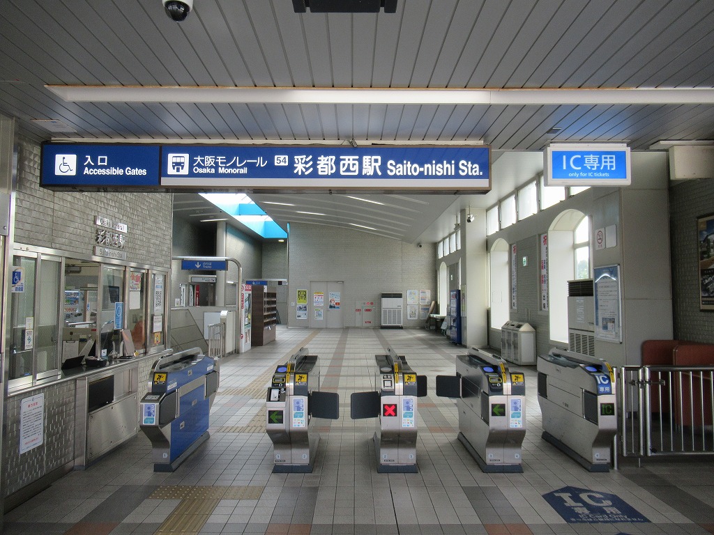 彩都西駅 大阪モノレール彩都線の終点、彩都西の改札画像です。 駅名標、当駅は国際文化公園都市(彩都)の西部地区の玄関駅であり、大阪モノレール彩都線の終着駅となっている。 駅舎、当駅は橋上駅となっている。 改札口、自動改札機が4通路設置されている。 改札横には2台の自動券売機が設置され、有人窓口も設けられている。 ホームは島式1面2線のホームで、掘割状の場所にホームがある。 ————————————— 所在地:大阪府茨木市 乗入路線 ■ 国際文化公園都市線(彩都線)