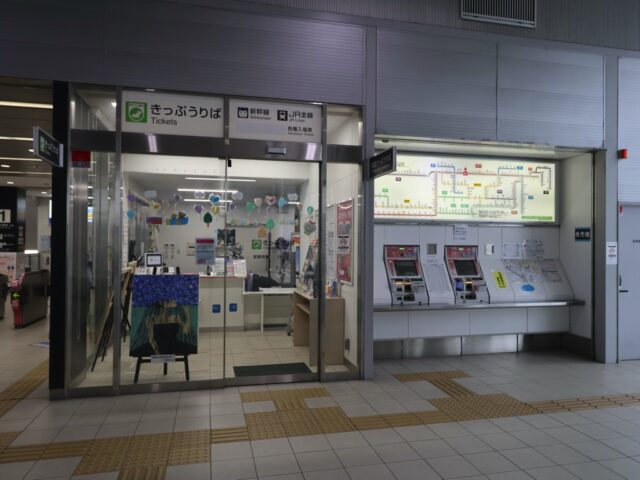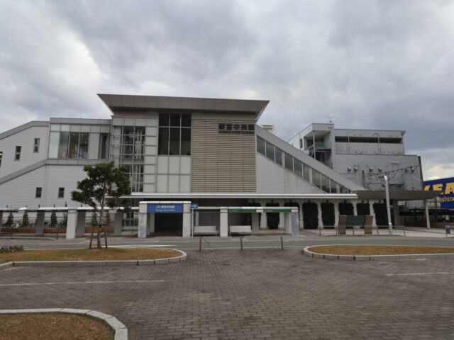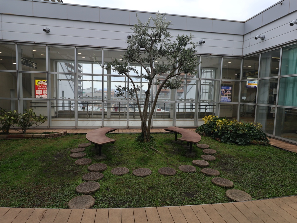 当駅では橋上駅舎内に植樹がなされた広場が設置されていることが特徴的である