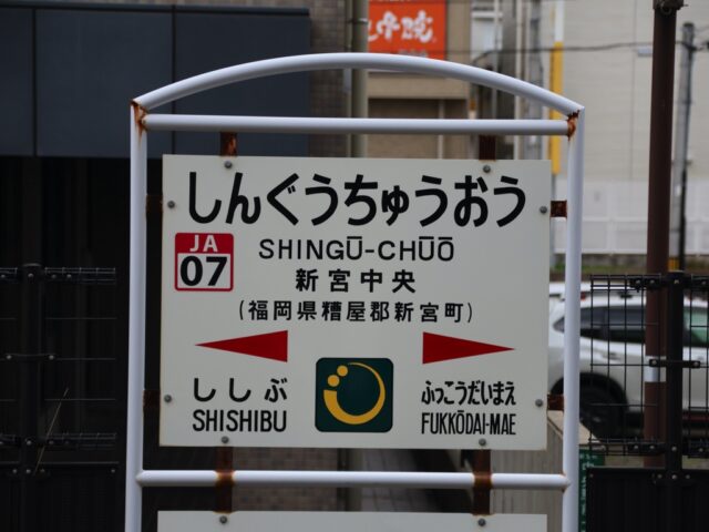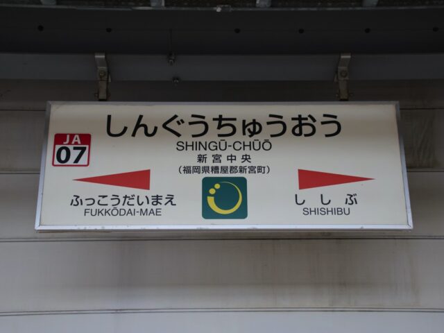 駅名標、新宮町の町章が駅名標に入っている。当駅は2010年に開業した駅であり、福岡県糟屋郡新宮町に立地する唯一のJR駅である。