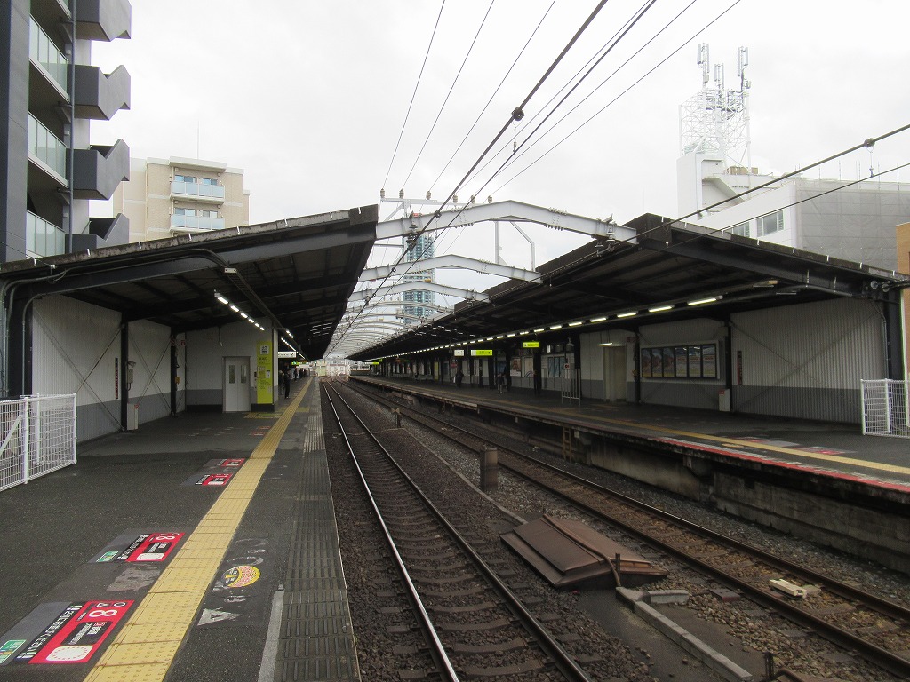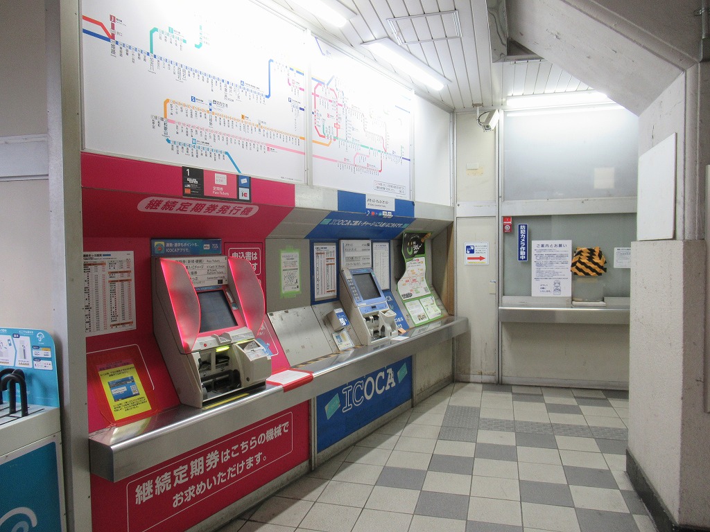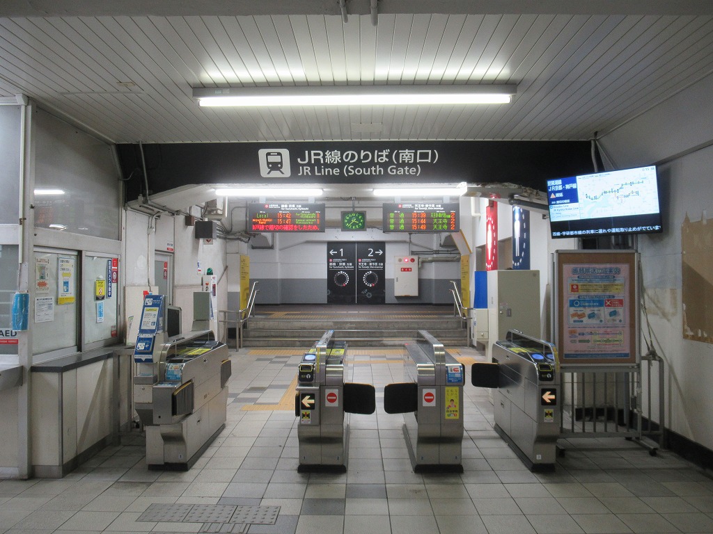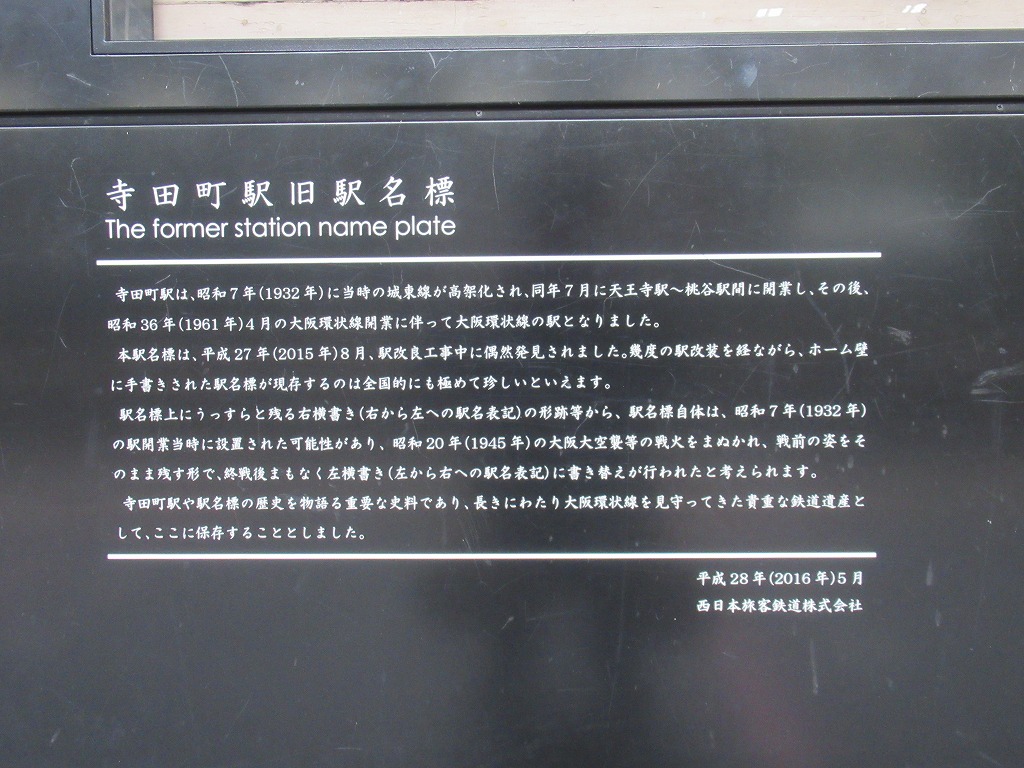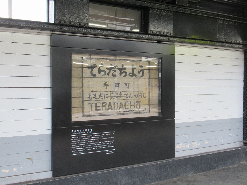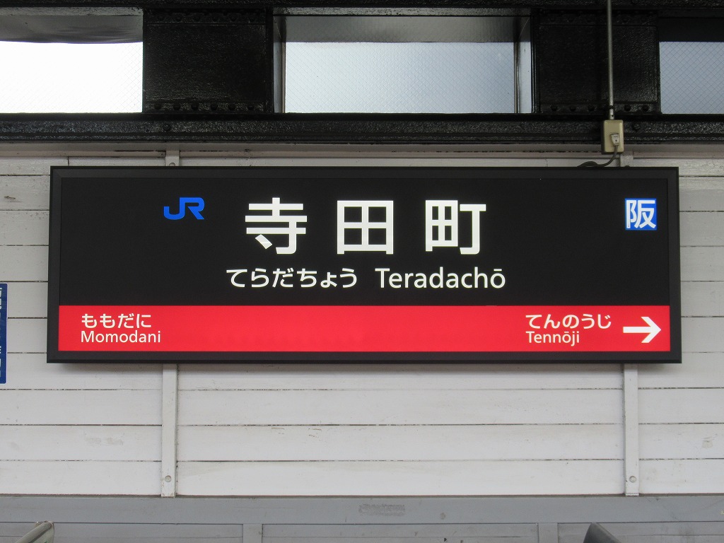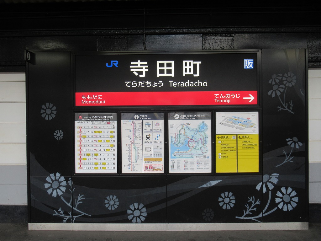 寺田町駅 大阪環状線の駅、寺田町の改札画像です。 駅名標大、大阪環状線の駅名標は他路線と異なり黒地に白文字の駅名標となっている。 自立式駅名標 北口駅舎、環状線の駅はリニューアルが進んでいるが、当駅はまだリニューアルされていない。 駅入口は高架の真下にある。 駅舎には古いタイプの第一種駅名標も掲げられている。 北改札口、自動改札機が5通路設置された有人改札になっている。 北口改札にはみどりの券売機を含む3台の自動券売機が設置されている。またかつてのみどりの窓口の跡は封鎖されている。 みどりの窓口が営業していたころの様子(2017年頃撮影) 南口駅舎 南改札口、自動改札機が3通路設置された無人改札になっている。 南改札には2台の自動券売機が設置されている。またかつての有人窓口跡は現在は封鎖されている。 ホームは相対式2面2線の高架ホームになっている。 天王寺方面ホームには古い駅名標画展示されている。 この駅名標は2015年に行われた駅の改修工事時に偶然発見されたもので、撤去されることなく駅で保存されることとなった。 旧駅名標の説明書き ————————————— 所在地:大阪市天王寺区 所属路線 ■ 大阪環状線 ■ 大阪環状線 隣の駅リンク <-天王寺駅 - 寺田町駅 - 桃谷駅->