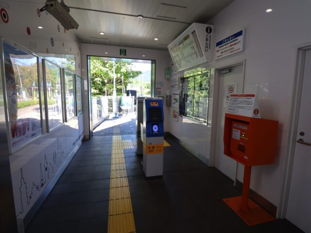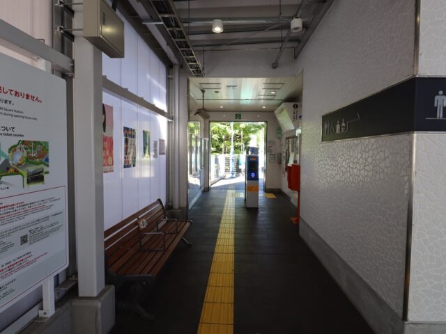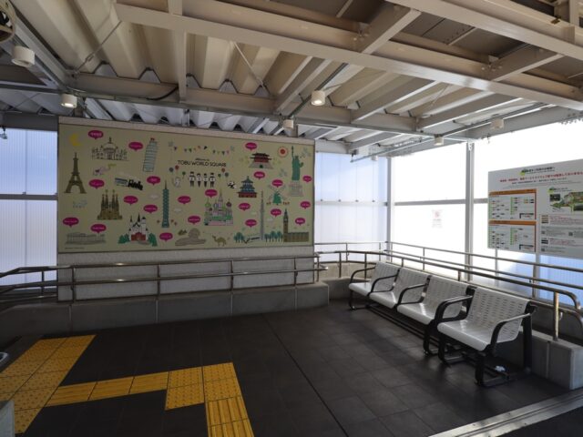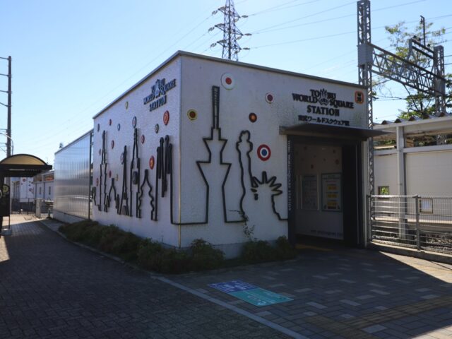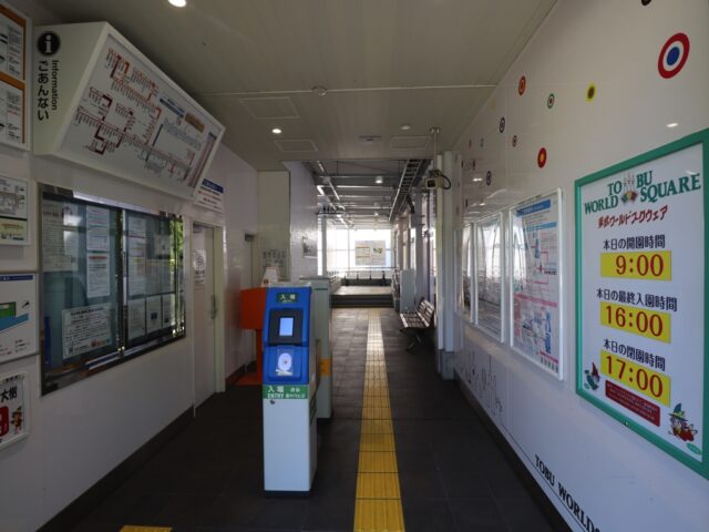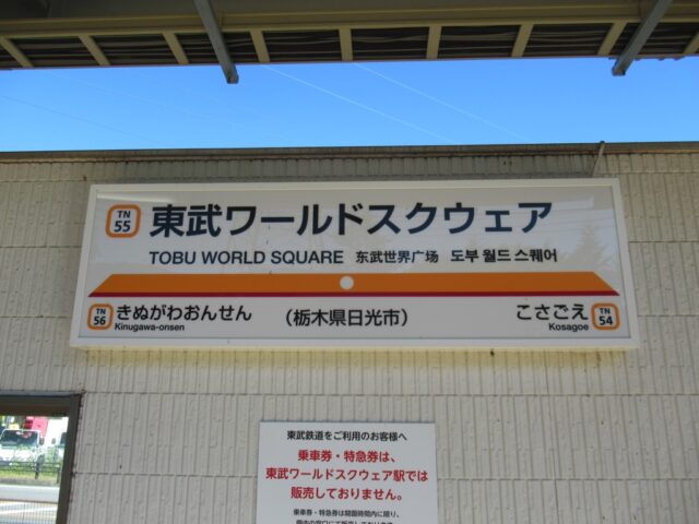 東武ワールドスクウェア駅 東武鬼怒川線の駅、東武ワールドスクウェアの改札画像です。 駅名標、当駅は2017年に開業した鬼怒川線で最も新しい駅であり、「東武ワールドスクウェア」の最寄駅である。「東武ワールドスクウェア」は世界各国の遺跡や建築物を再現した、東武鉄道系列のミニチュアパークである 駅舎、箱形の駅舎には自由の女神やビッグ・ベンなど、東武ワールドスクウェア内に再現されている世界各国の建築物がデザインされている。その中でも東武鉄道自社が建築した「東京スカイツリー」はひときわ大きくデザインされている 改札口、当駅は無人駅となっており、IC専用簡易改札機が設置されている 出場側から見た改札口の様子 改札口からホームへの通路上に待合スペースが設けられている ホーム上にも待合スペースが設けられている ホーム上に設けられた待合スペース ホームは単式1面1線の棒線駅であり、列車の行き違いは不可能である。当駅は東武ワールドスクウェアの最寄駅のため特急列車も停車する ホーム上に設置された東武ワールドスクウェアの歓迎看板、世界各地の言語が表記されている 東武ワールドスクウェアは鬼怒川線が近くを通るにもかかわらず、当駅開業前までは小佐越駅から徒歩でアクセスする必要があったが、当駅の開業により入園ゲートまで徒歩1分でアクセスできるようになり、鉄道アクセスの利便性が飛躍的に向上した ————————————————— 所在地:栃木県日光市 乗入路線 ■ 東武鬼怒川線
