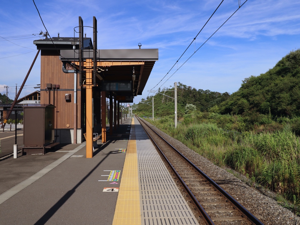 駅名標、当駅は2011年3月11日の東日本大震災時に被害を受け長らく運休となっていたが、2015年5月30日に運行を再開した。運行再開に伴い当駅は内陸に移設されている