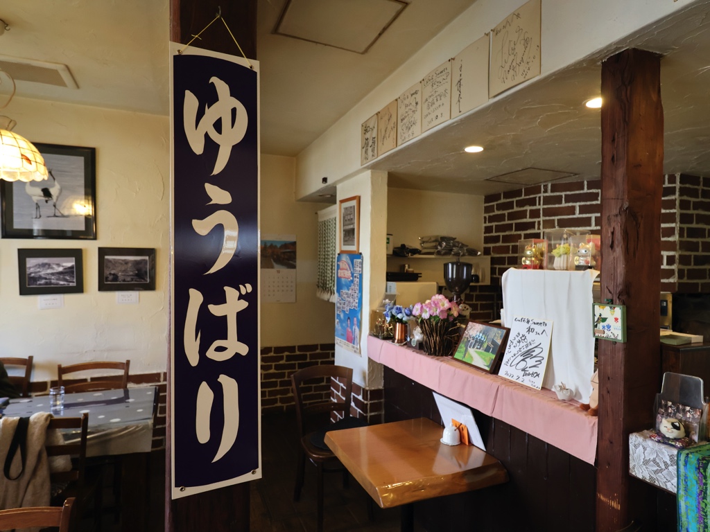 喫茶店内には筆文字タイプの駅名標のレプリカが保管されていた
