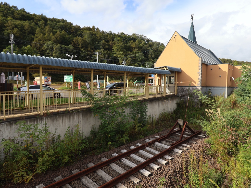 駅舎、当駅は石勝線夕張支線の廃止に伴い2019年に廃駅となった。廃止当時に使用されていた洋風デザインの駅舎は喫茶店として活用されている