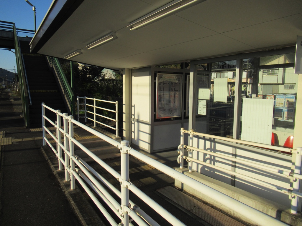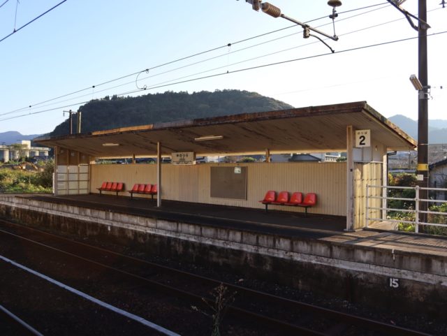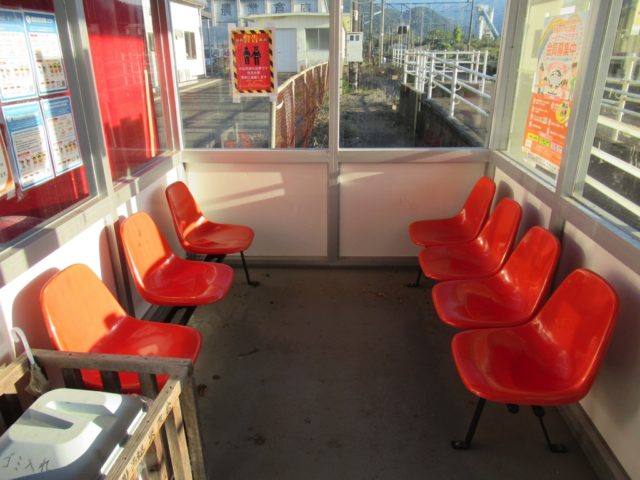 駅舎、九州島内の他駅でも設置例の見られる簡易的な駅舎となっている