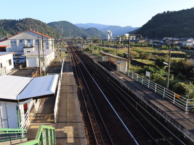 駅名標、当駅ー津奈木間は8.7キロ離れており、肥薩おれんじ鉄道内では最も駅間距離が長い